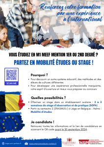 L’INSPÉ de l’académie de Poitiers offre aux étudiants en Master MEEF mention 1er degré la possibilité d’effectuer le semestre 2 en Erasmus+ mobilité d’études, dans le cadre d’un accord bilatéral avec la Haute Ecole Libre de Mosane à Liège en Belgique qui forme les futurs enseignants du primaire et secondaire.